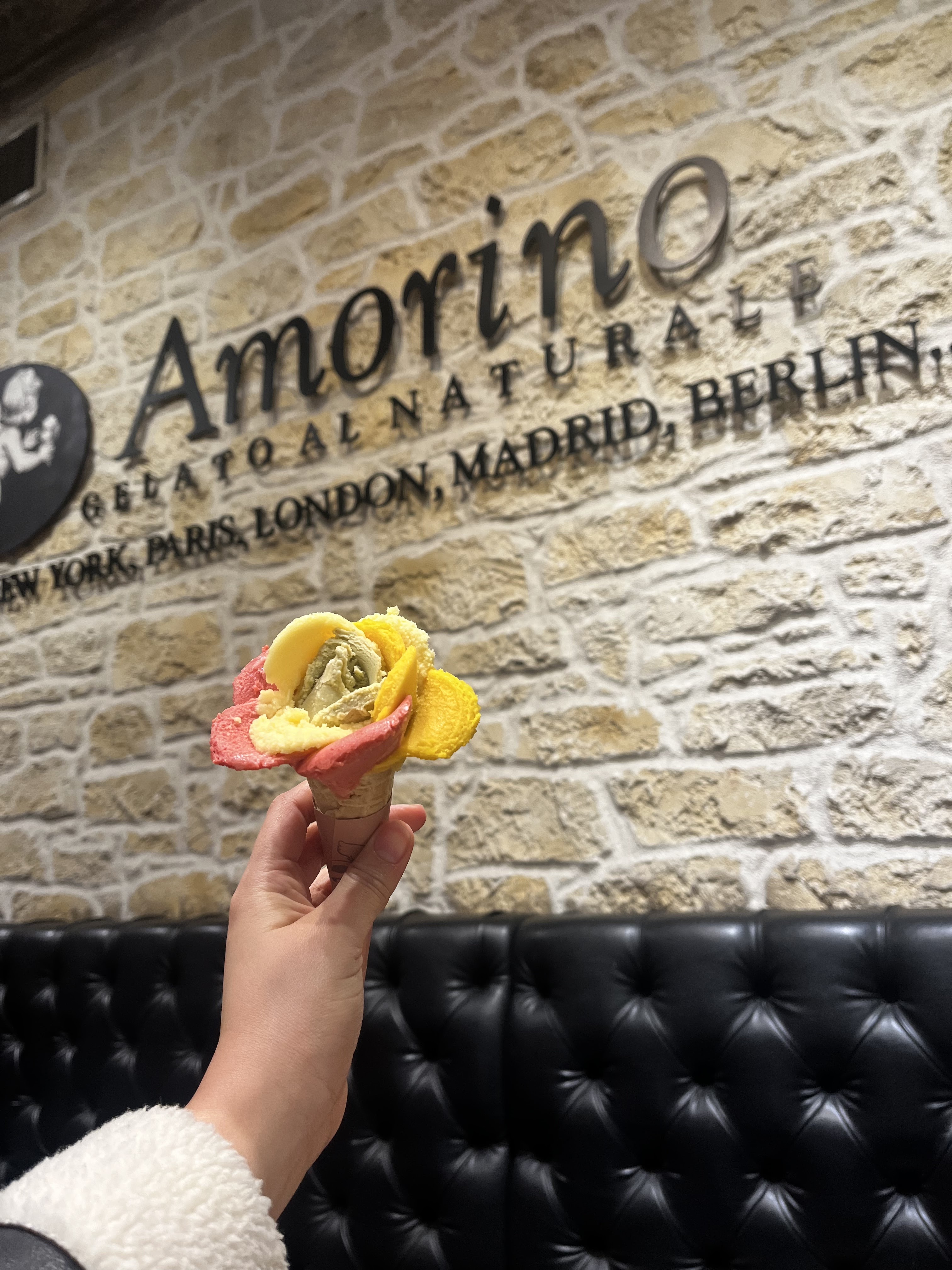 Première fois que je venais à Amorino. Une queue d’attente super longue parce que le service allait au ralenti... il fallait être patient. Les glaces étaient bonnes mais sans plus. La stracciatella avait pas vraiment de goût. Rien d’incroyable. Grosse déception.