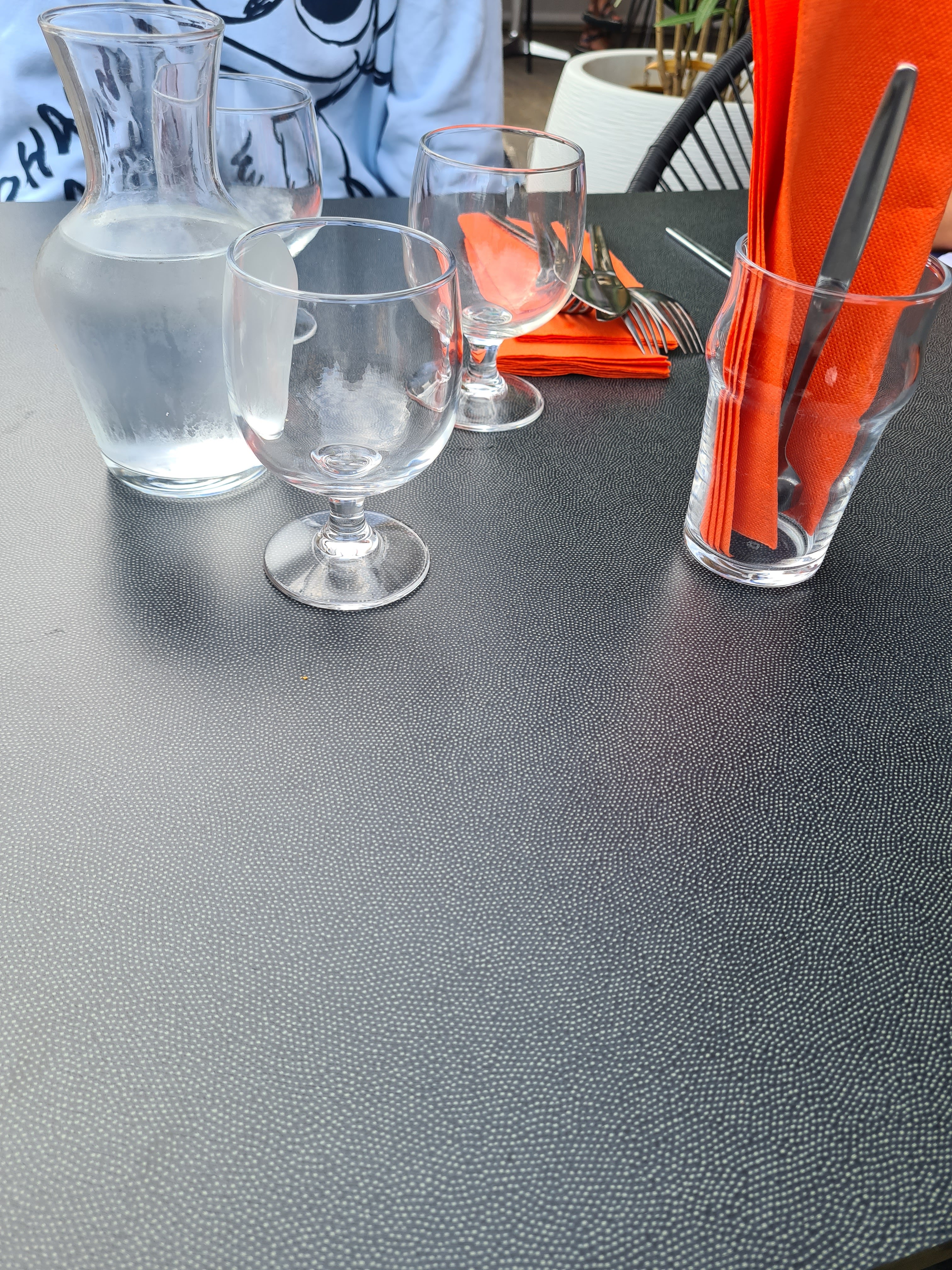 En arrivant on nous a autorisé à s'assoir à une table non débarrassée. La serveuse nous a amené des cartes. Elle a mit 20mn à prendre la commande (on a demandé un café offert pour tous ces désagréments, il n'est jamais arrivé), 25 mn pour que la table soit enfin débarrassée mais pas lavée. La serveuse nous a amené une carafe d'eau, verres, couverts serviettes comme sur la photo demmerdez vous! Au bout de 30mn après notre arrivée nous sommes enfin servis (photo jointe) (sans excuse et après un autre groupe arrivé après nous) et elle est obligée de repartir supplément de chocolat oublié pour des boules de glaces. Et pour payer il faut aller les trouver car sinon on n'y serait encore. On avait lu de bons avis mais au final déçus, apparemment la gaufre était bonne quand même, heureusement qu'il n'y a pas que du négatif mais pour au moins 4 serveurs et terrasse pas pleine ...
