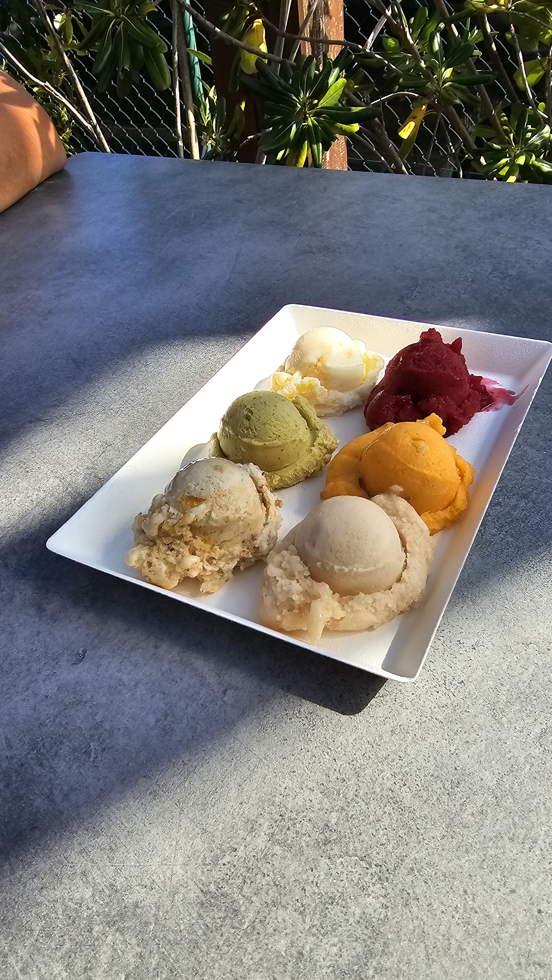 Ce lieu nous a été recommandé par les propriétaires du jardin d'Eden. Une belle découverte ! Ma fille a pris 2 boules cerise et myrtille, j'ai choisi citron-hibiscus et basilic-menthe. On a l'impression de déguster une vraie glace pour la première fois de sa vie ! Et on a envie de poursuivre sur d'autres parfums à peine le cornet terminé. Prix un peu plus élevé que les glaces traditionnelles et non artisanales mais on est prêt à payer plus cher pour manger ce type de produit, il n'y a aucun doute me concernant !! Continuez à nous étonner et à faire vivre les produits locaux. Serveuse super sympa et très agréable au passage, c'est appréciable également.