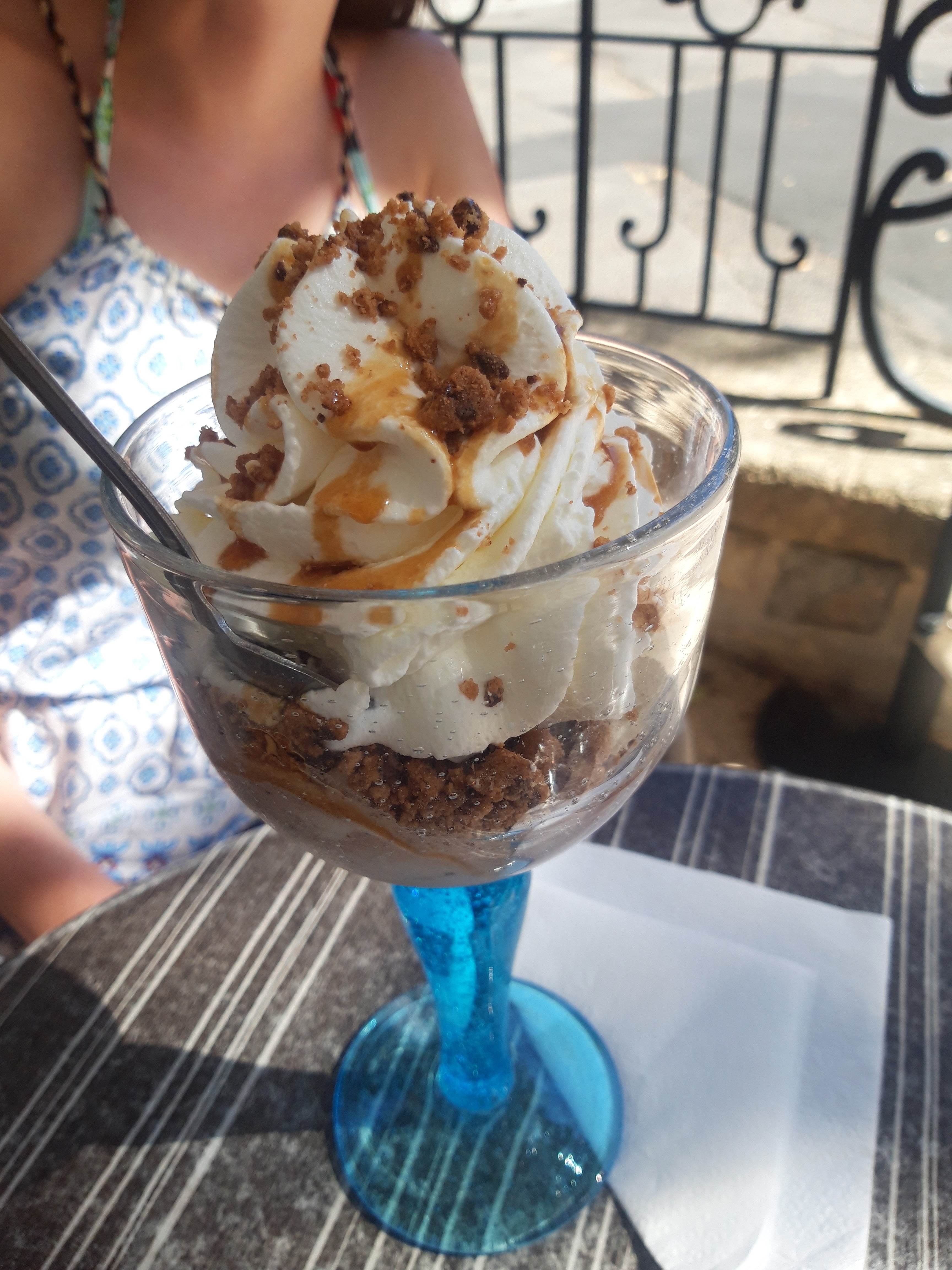 C’est agréable car c’est en terrasse ouverte ! Compter entre 12 et 15€ la glace dont l’effet fait sensation et pourtant c’est tape à l’œil plus que copieux. Les crêpes sont servies seulement en fin de journée.