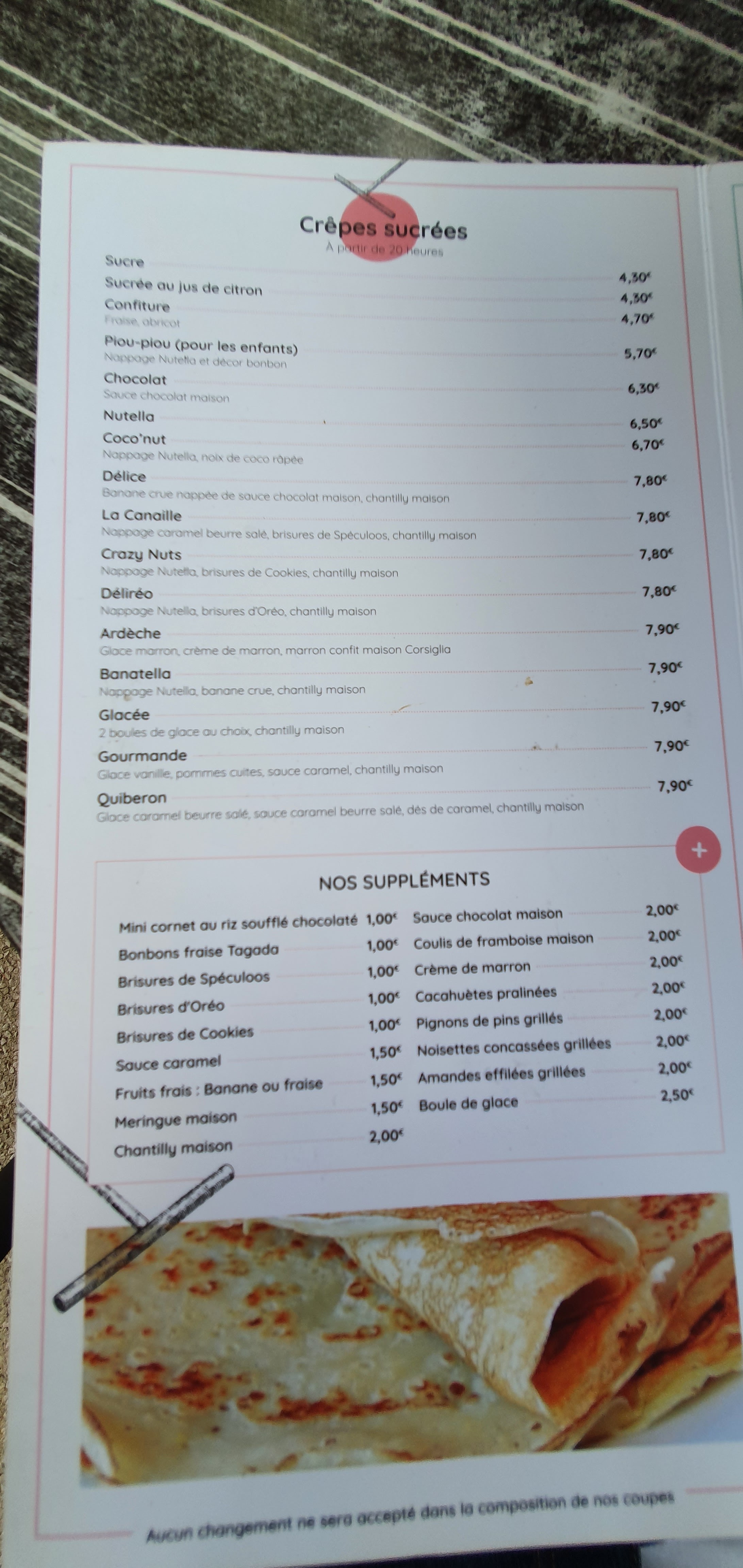 Les crêpes font 8 euros . La glace coute 12 euros. La crêpe n'était pas chaude et les bananes étaient verte , dure. La chantilly n'était pas faite maison et en faible quantité alors que c'était noté fait maison sur la carte.Tres déçu . Ça ne vaut pas le prix payé.