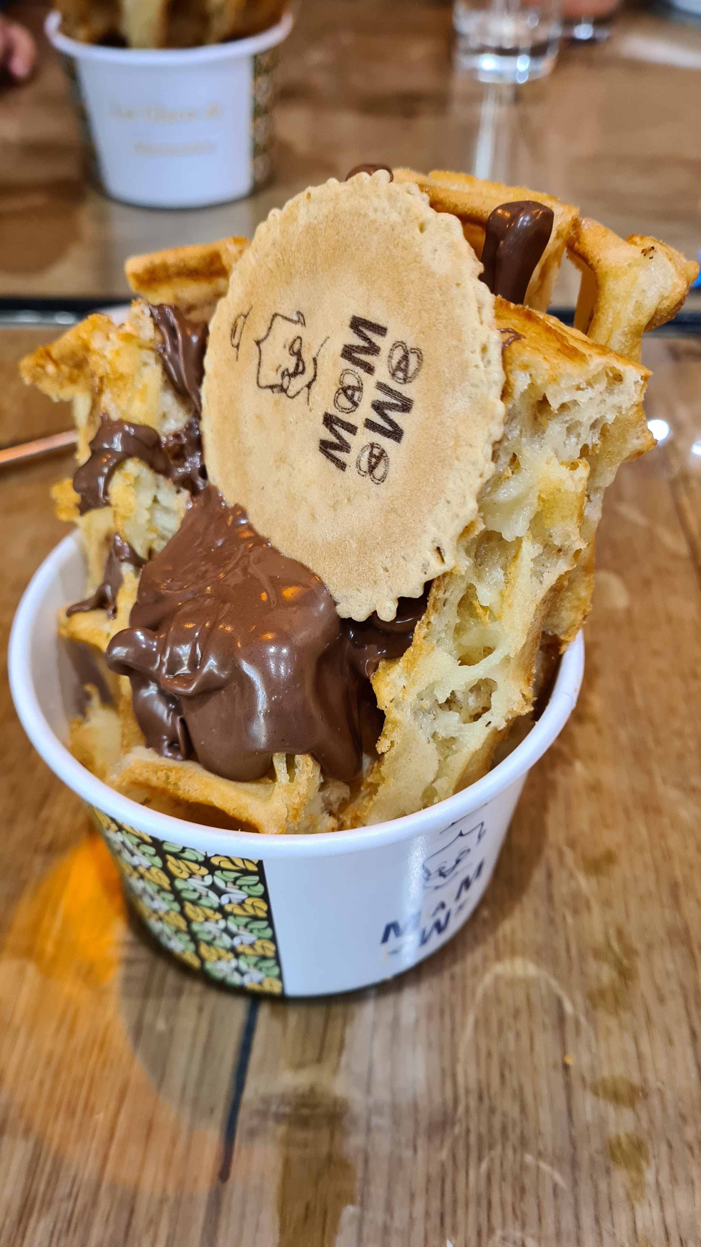 je suis désolé de le dire mais sa vaut pas le détour gauffre coupe en morceaux dans un gobelet pas de couverts pas de serviette et franchement sa vaut le prix